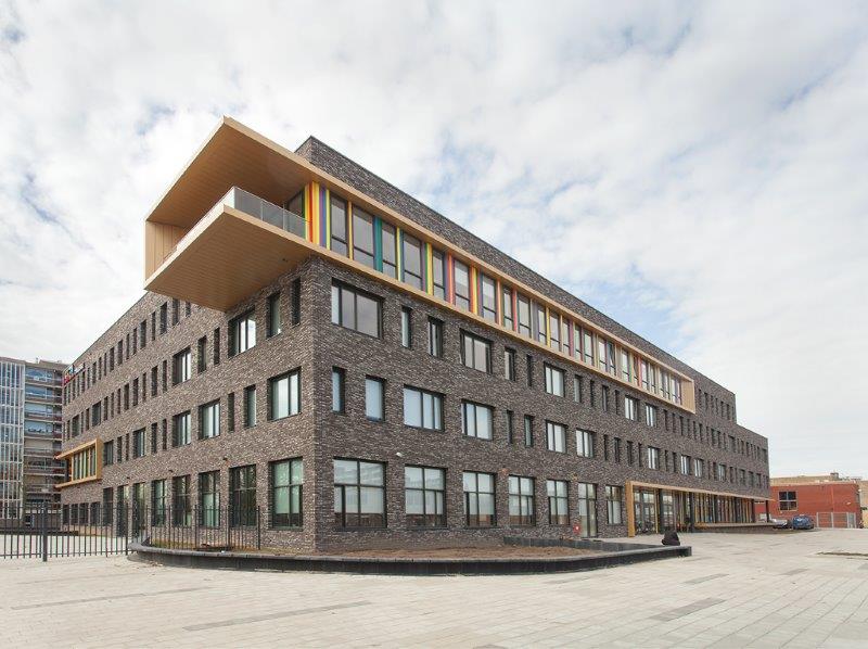 Het nieuwe schoolgebouw voor VMBO, HAVO en VWO van bijna 10.000 m² bvo bestaat uit vier bouwlagen en heeft een groot centraal atrium.
