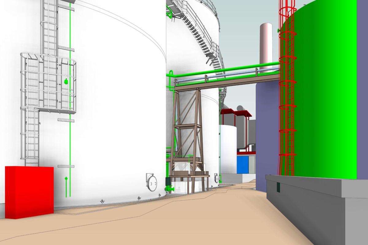 Additionally, SWINN created a 3D model that includes all supply and discharge cables and pipes. The designs of the pipeline bridges, landings and staircases were subsequently combined with the piping model of the fermentation reactors. This made it possible to meticulously ensure that no conflicts would arise. This clash detection is part of each 3D model made by SWINN.