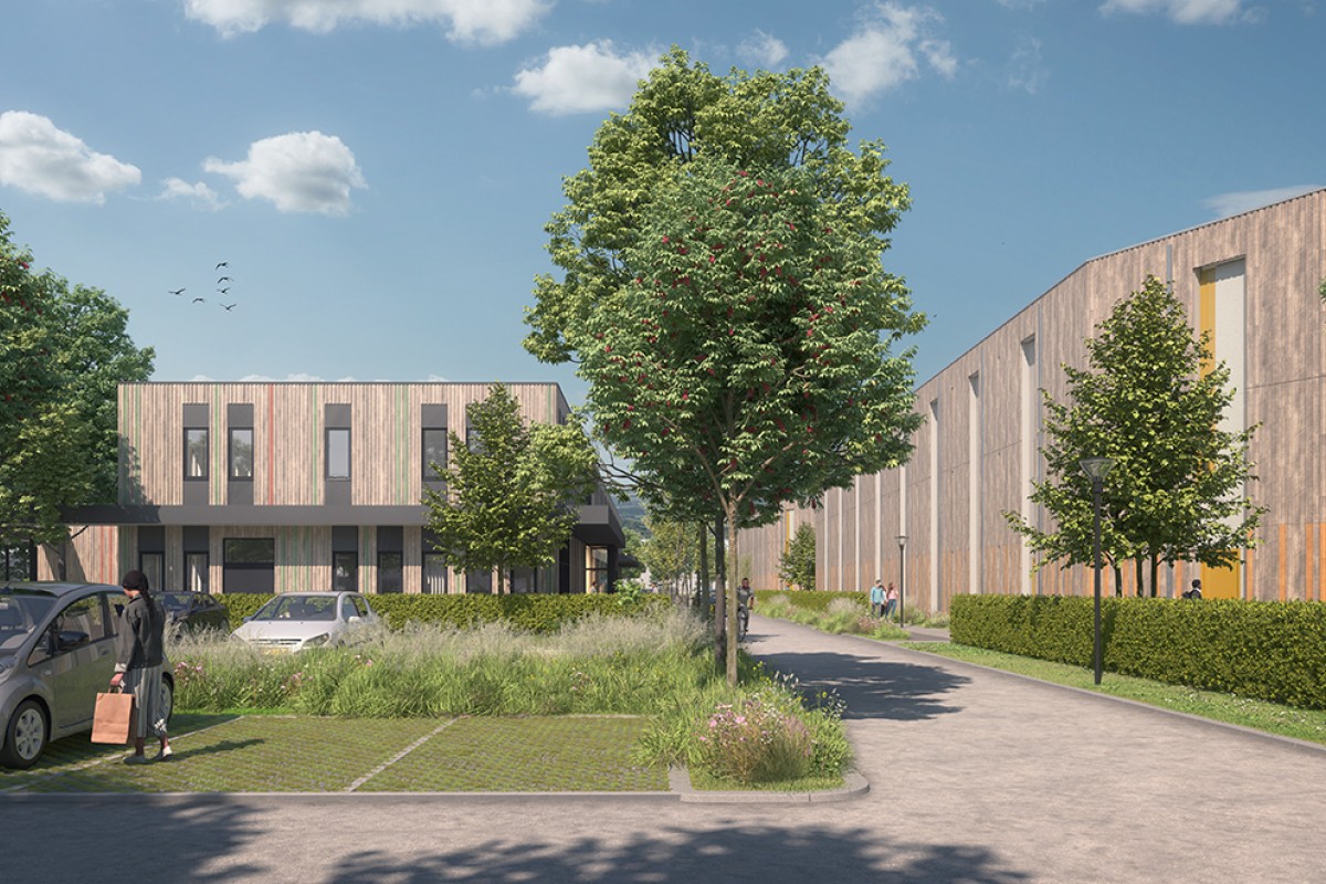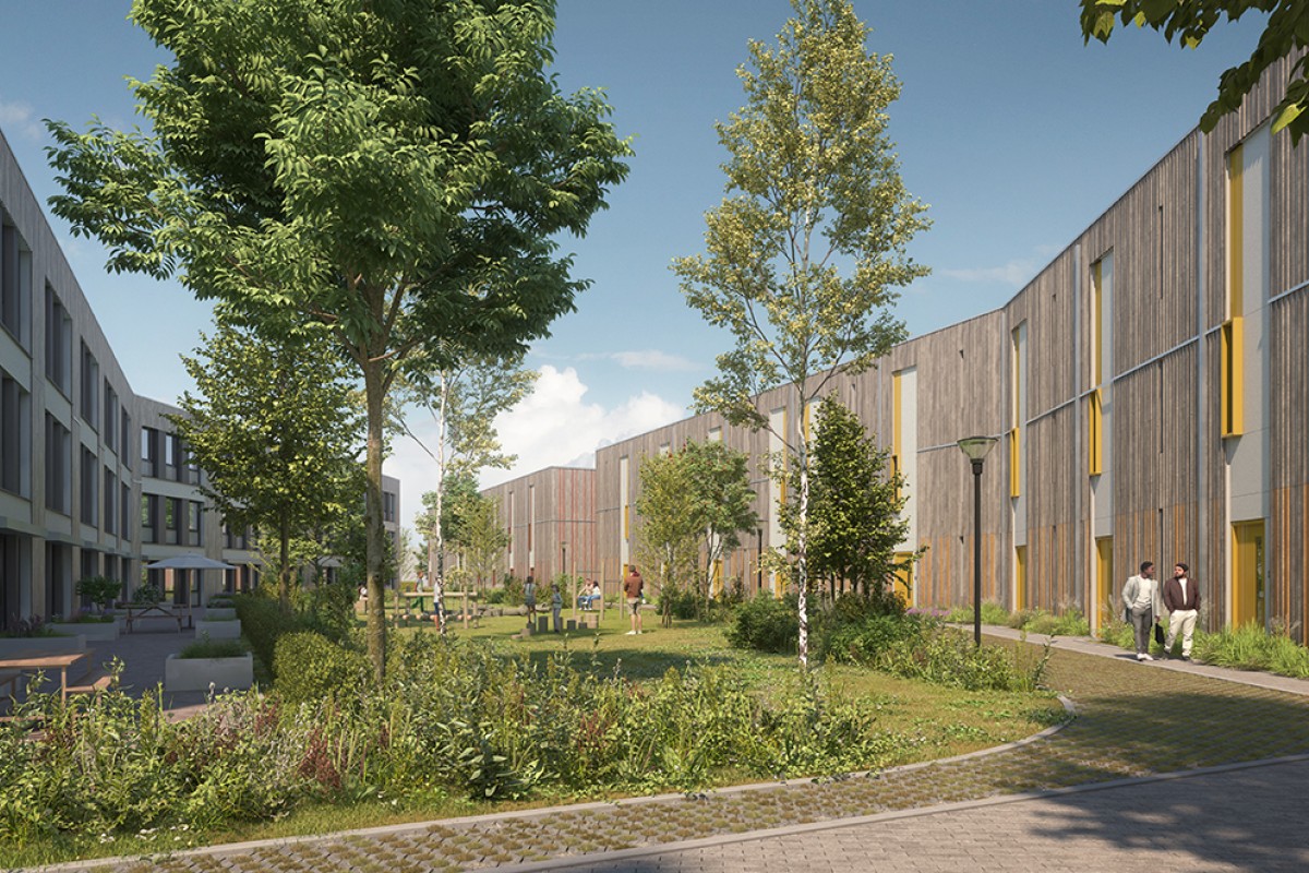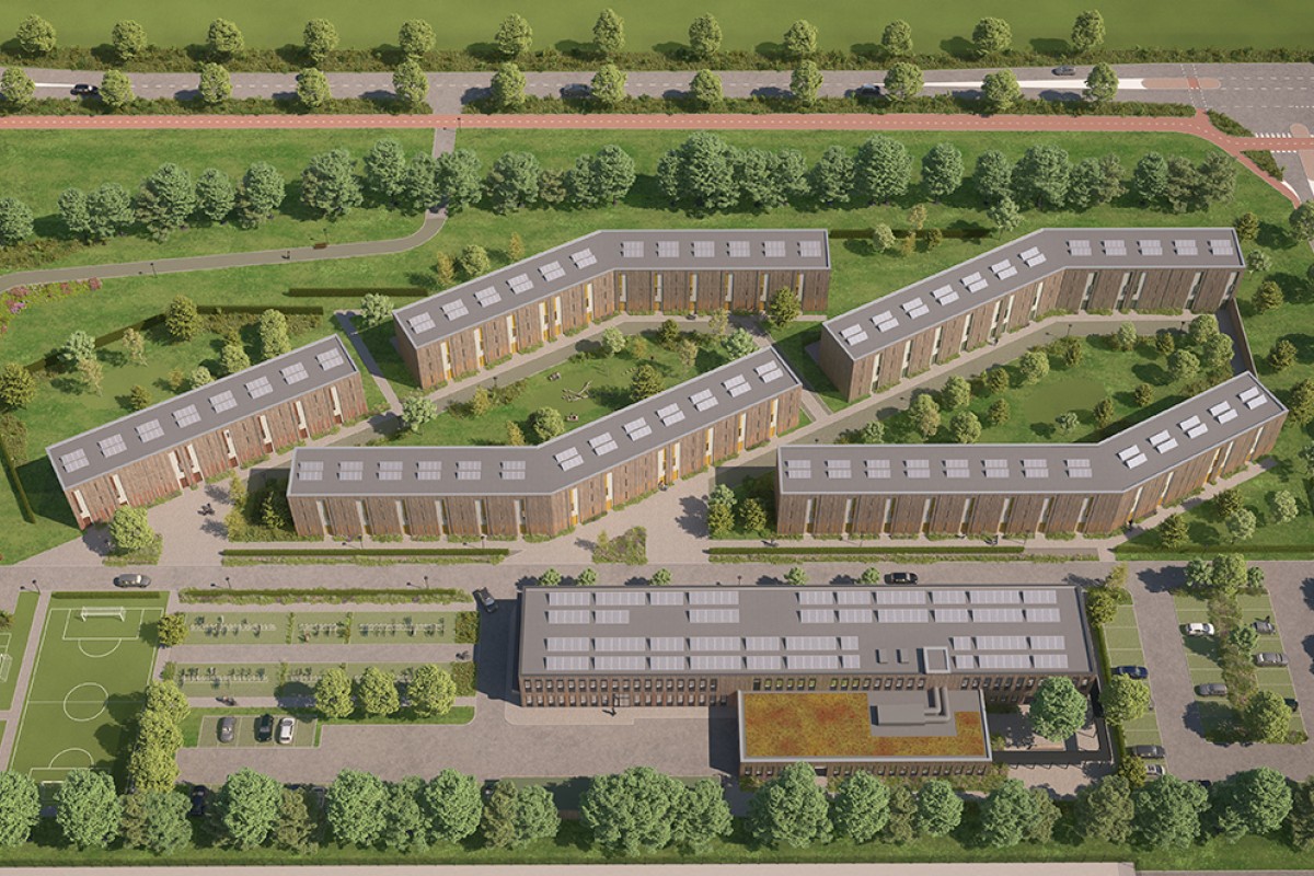 Houtbouwcomplex met een bvo van ca. 12.000 m2 met 9 woongebouwen in 3 bouwlagen en een hoofdgebouw in 2 bouwlagen.