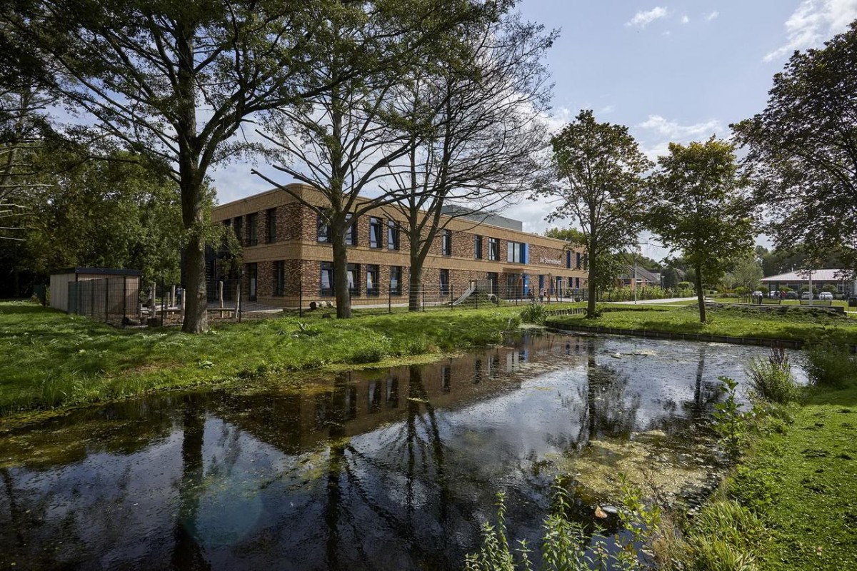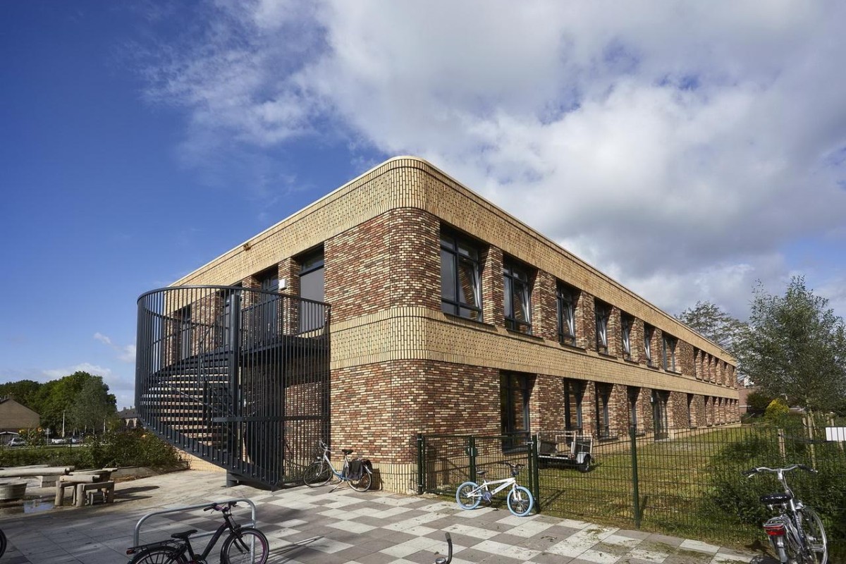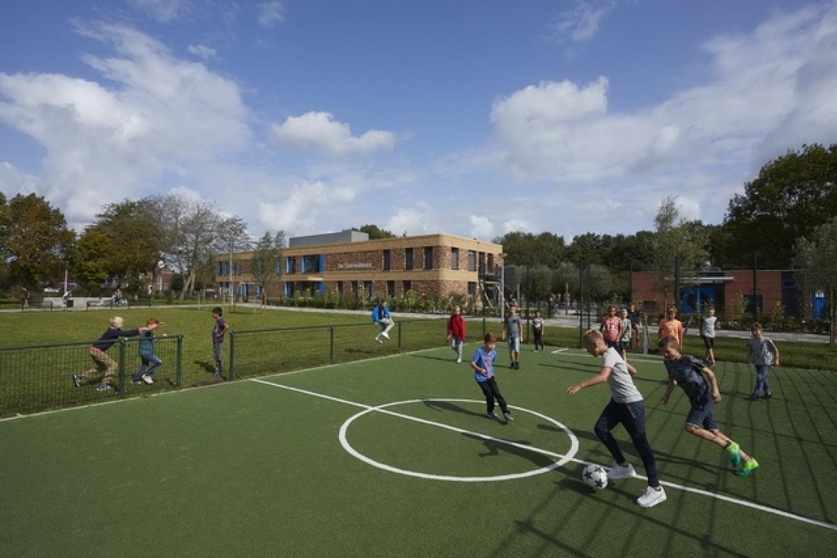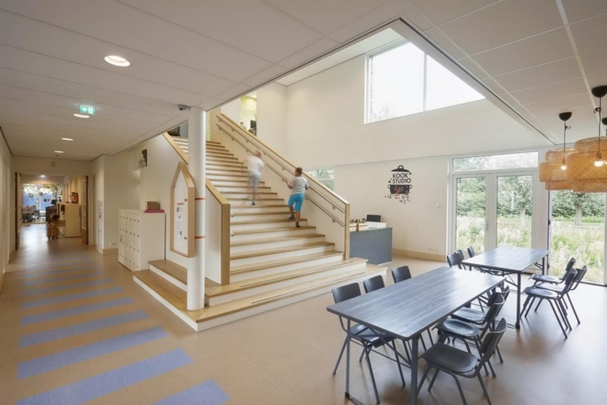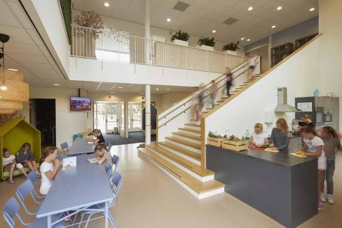 In het hart van het onderwijsgebouw bevindt zich een dubbel hoge ontmoetingsruimte.