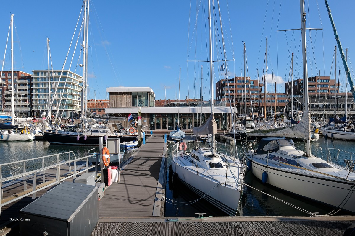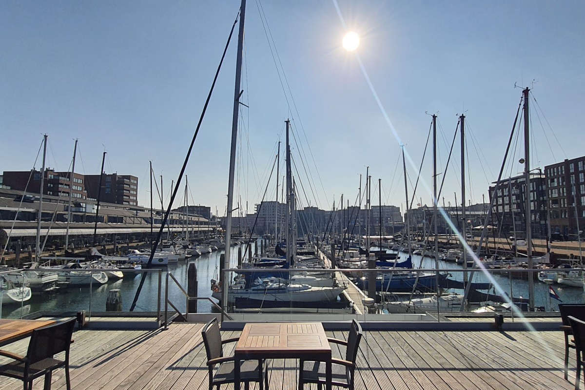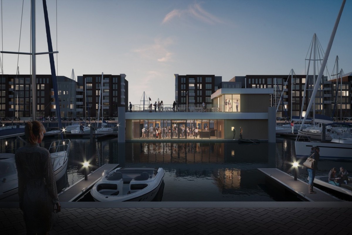 The new floating clubhouse, which is centrally located in the harbor, has a beautiful club room with a roof terrace on top.