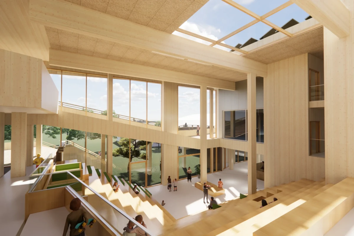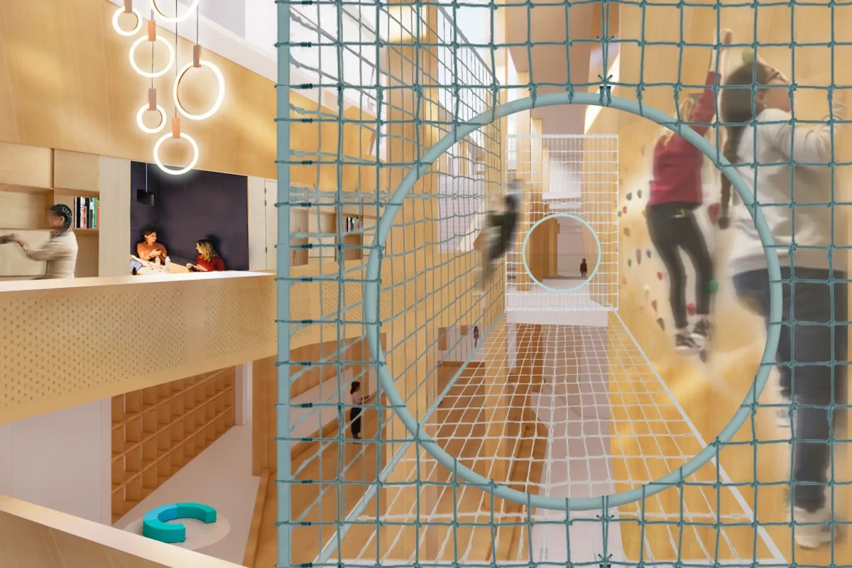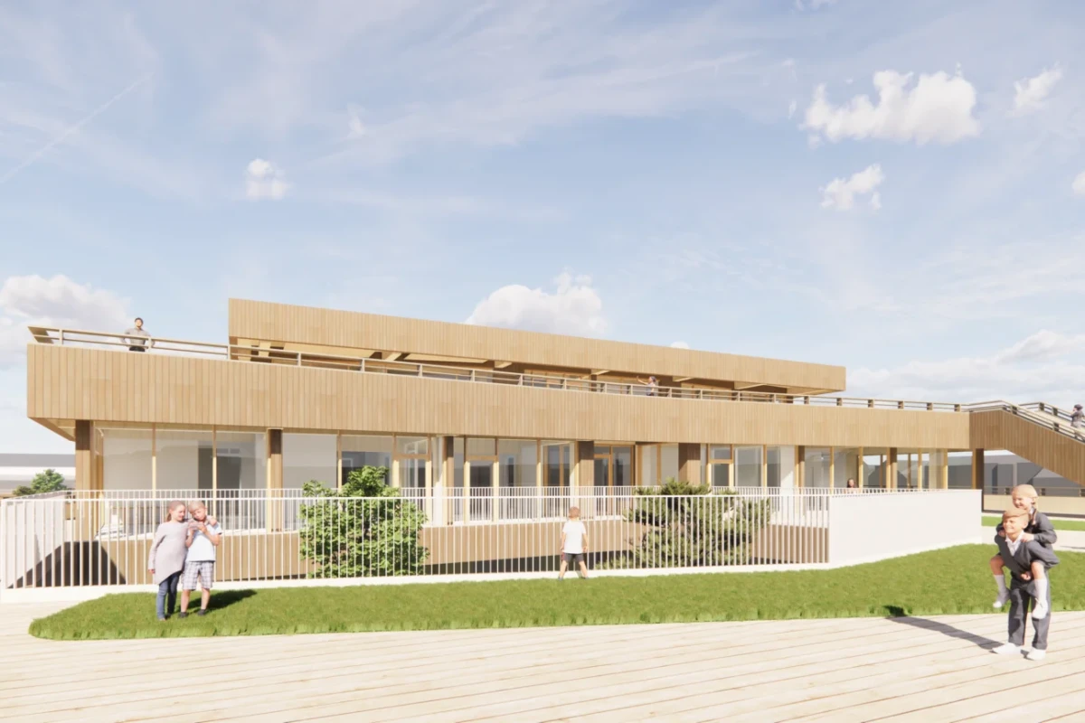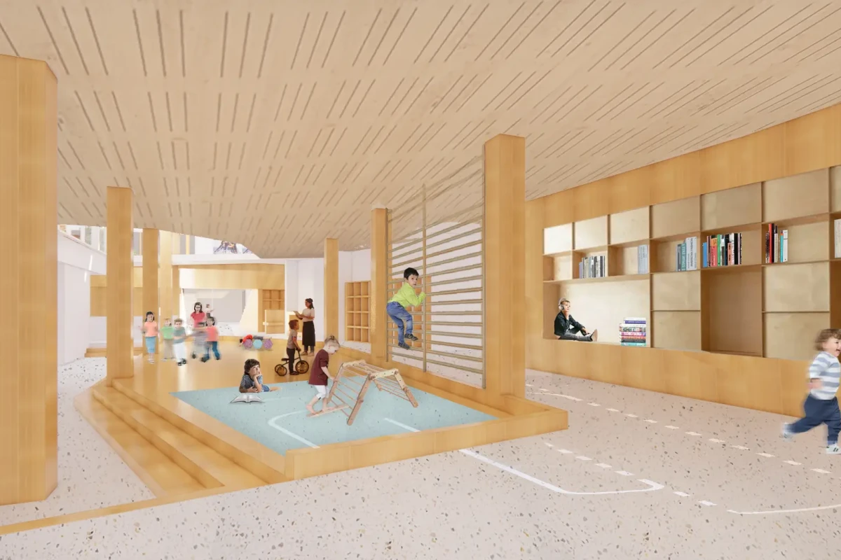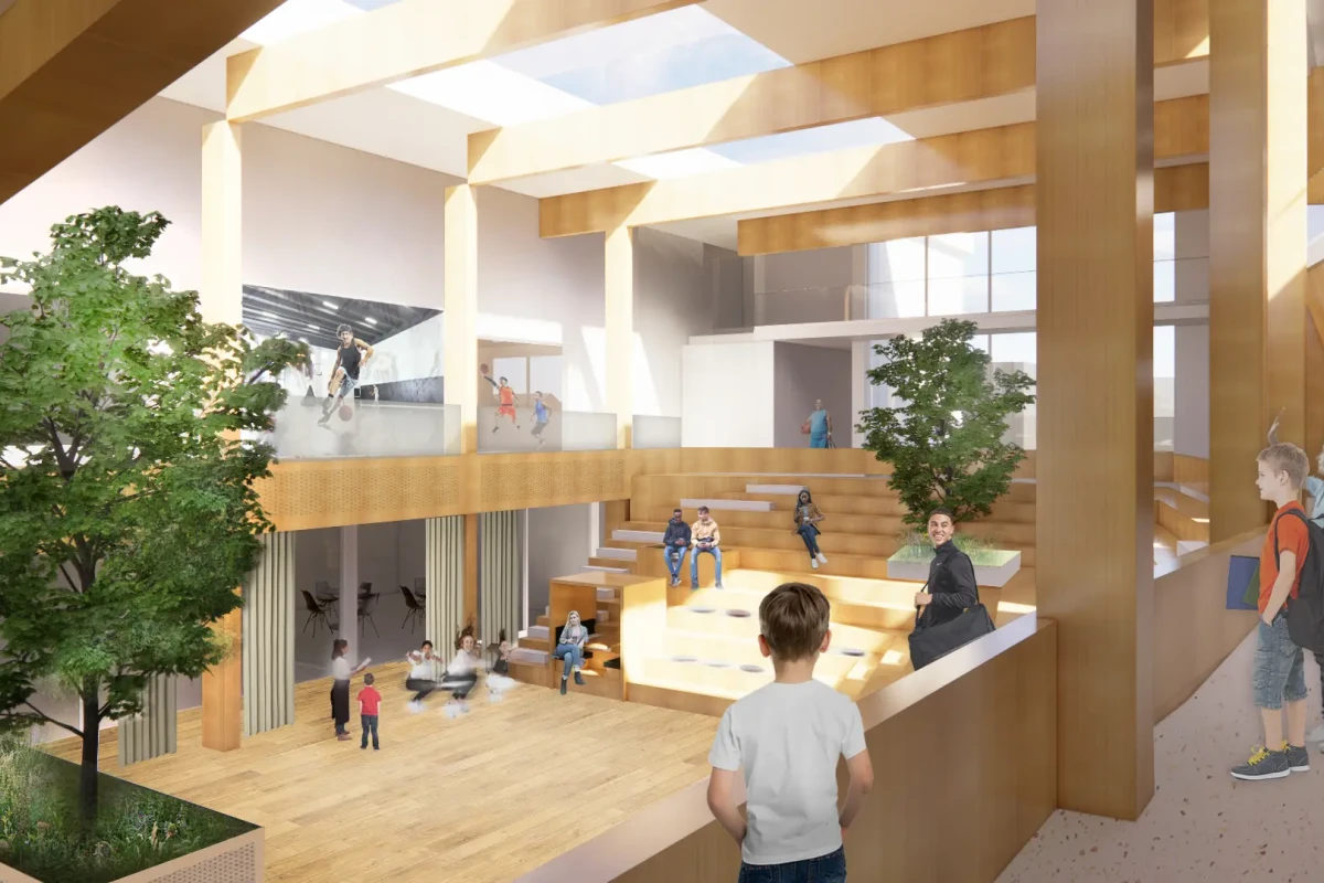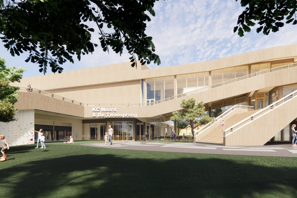 A circular complex with a GFA of 12,000 m2 and houses, among others, a primary school and BSO, a sports hall, a swimming pool and social functions.