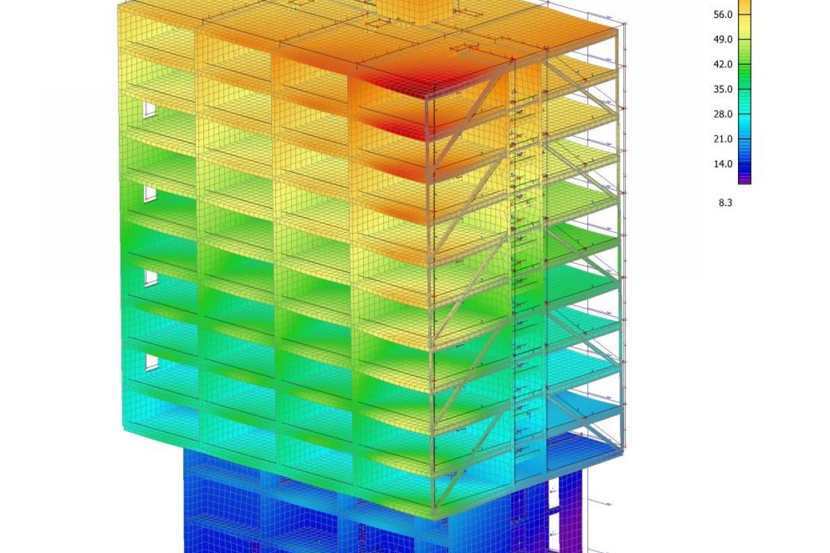 In the case of the smaller residential tower, measuring 45 metres, a hybrid construction of steel and concrete was used to achieve a cantilever of 3.90 metres from the end wall. On the bus station side, the cantilever is no less than 6 metres. This is entirely absorbed by the concrete partition walls of the dwellings. In the design, we consciously opted for weight-saving floors in the cantilevers and solid floors for the rest. This ensures a good balance in the building, which does not exert any tension on the piles. The second residential tower in the project is 75 metres high and has a beautiful cantilever on the 13th floor.