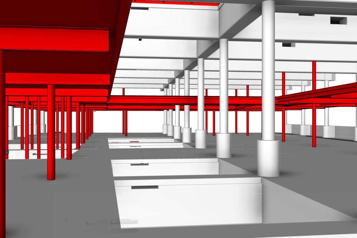 These new intermediate storeys will be constructed from a light structure comprising steel sheet concrete floors on steel girders, supported by the existing concrete columns as well as new steel columns. To connect the new steel girders to the existing round concrete columns, various possibilities were explored with a view to creating an optimal design with regard to architecture, the distribution of forces and execution.