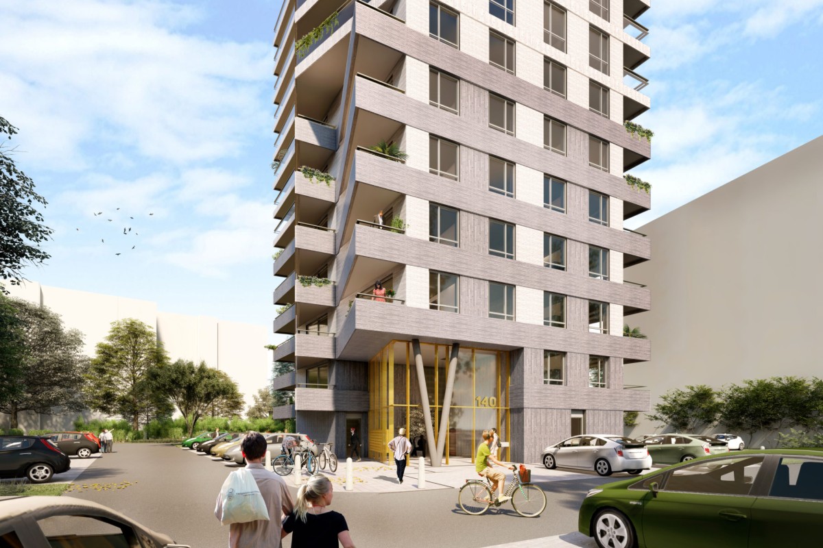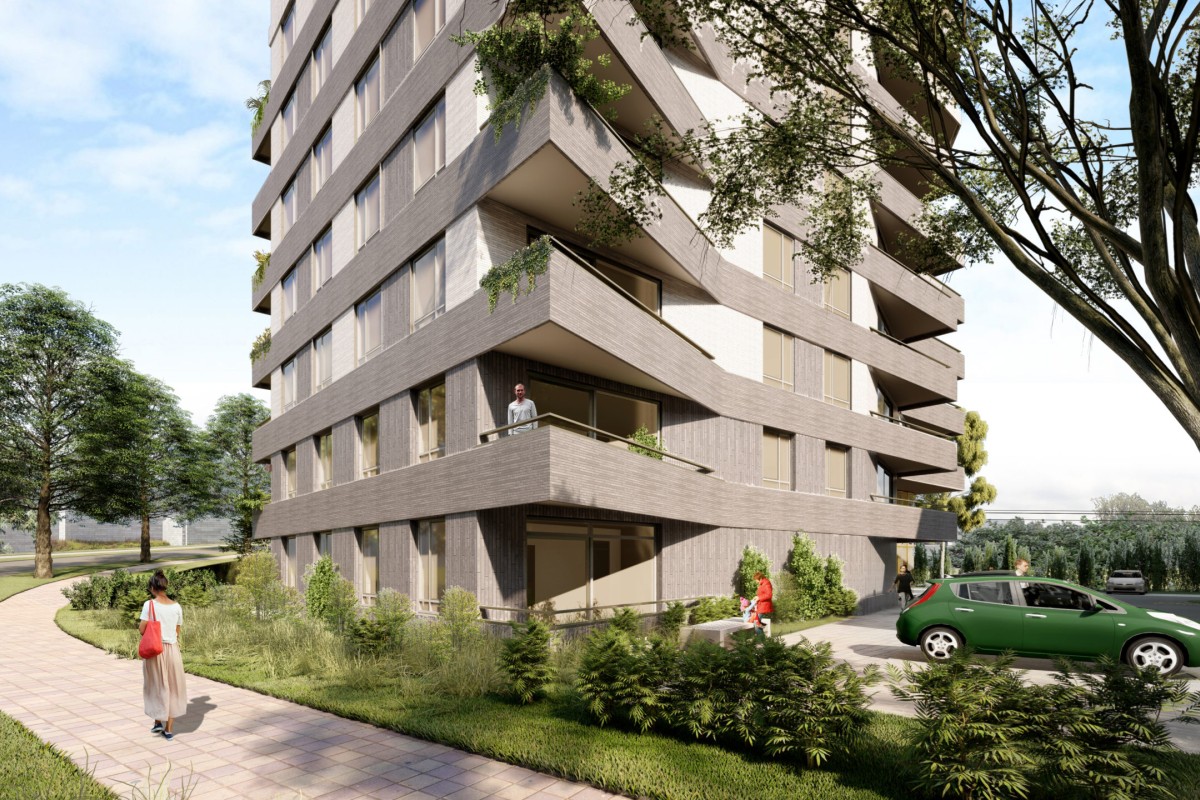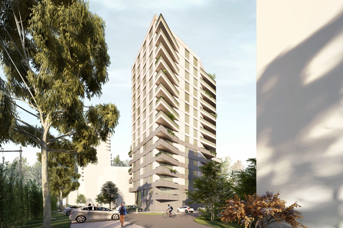 Apartment building with 85 dwellings spread over 15 floors with a bicycle shed and a work unit on the ground floor with a GLA of 6,765 m2.