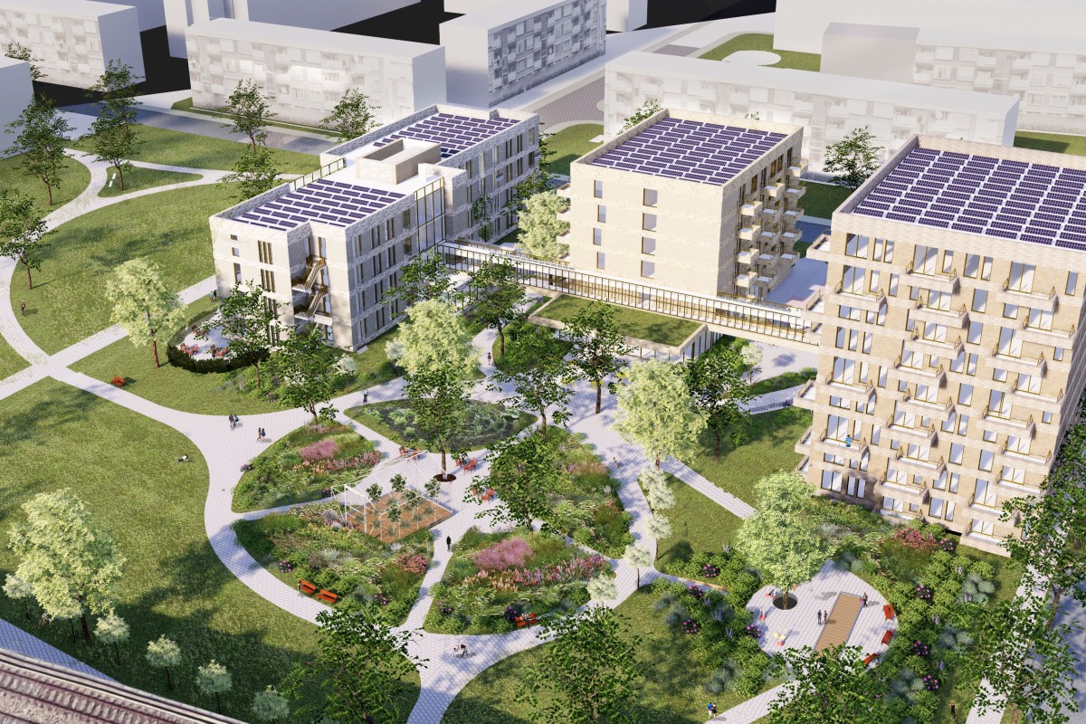 The care centre consists of 3 buildings for residential groups, with 11 assisted-living studios each, and 70 flats connected via an elevated corridor on the 1st floor.