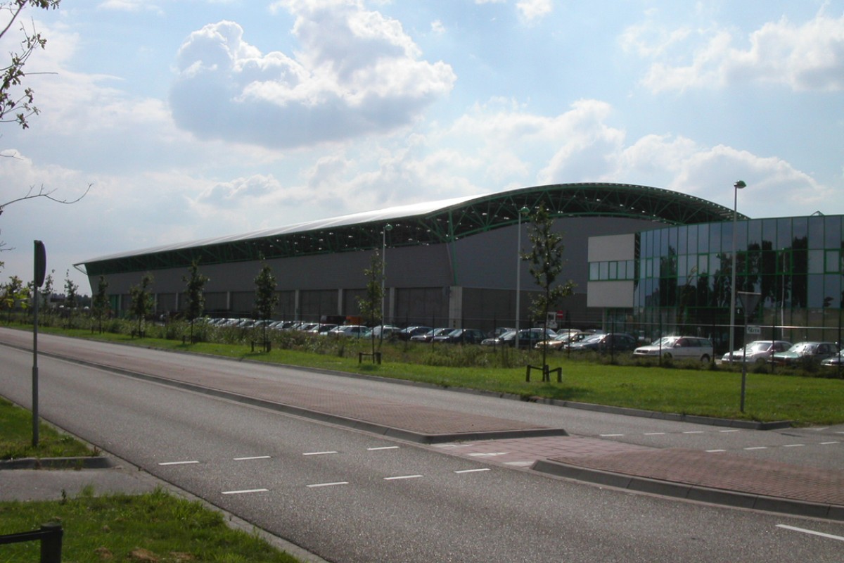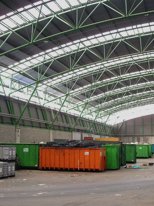 Afvalsorteercentrum van ca.7.250 m². Constructieprincipe: 3 dimensionaal gebogen stalen vakwerkspanten met een overspanning van 50m op betonnen bak.