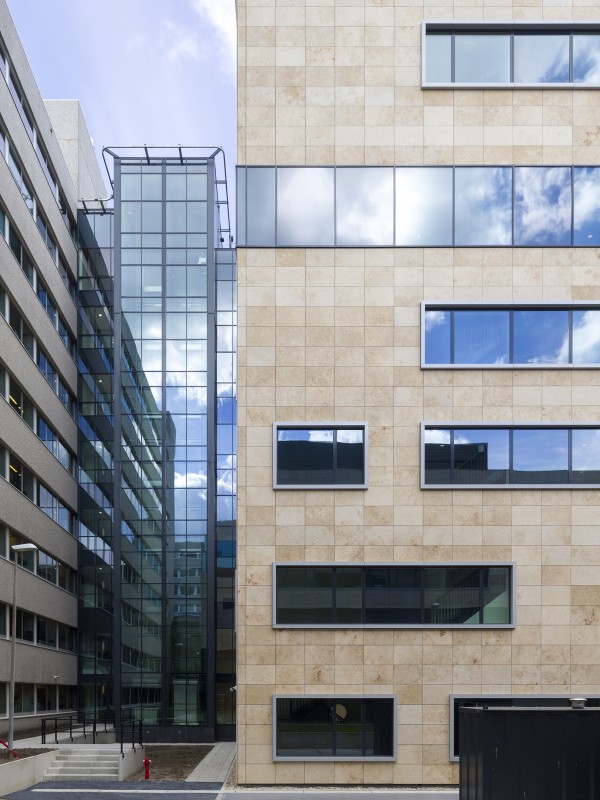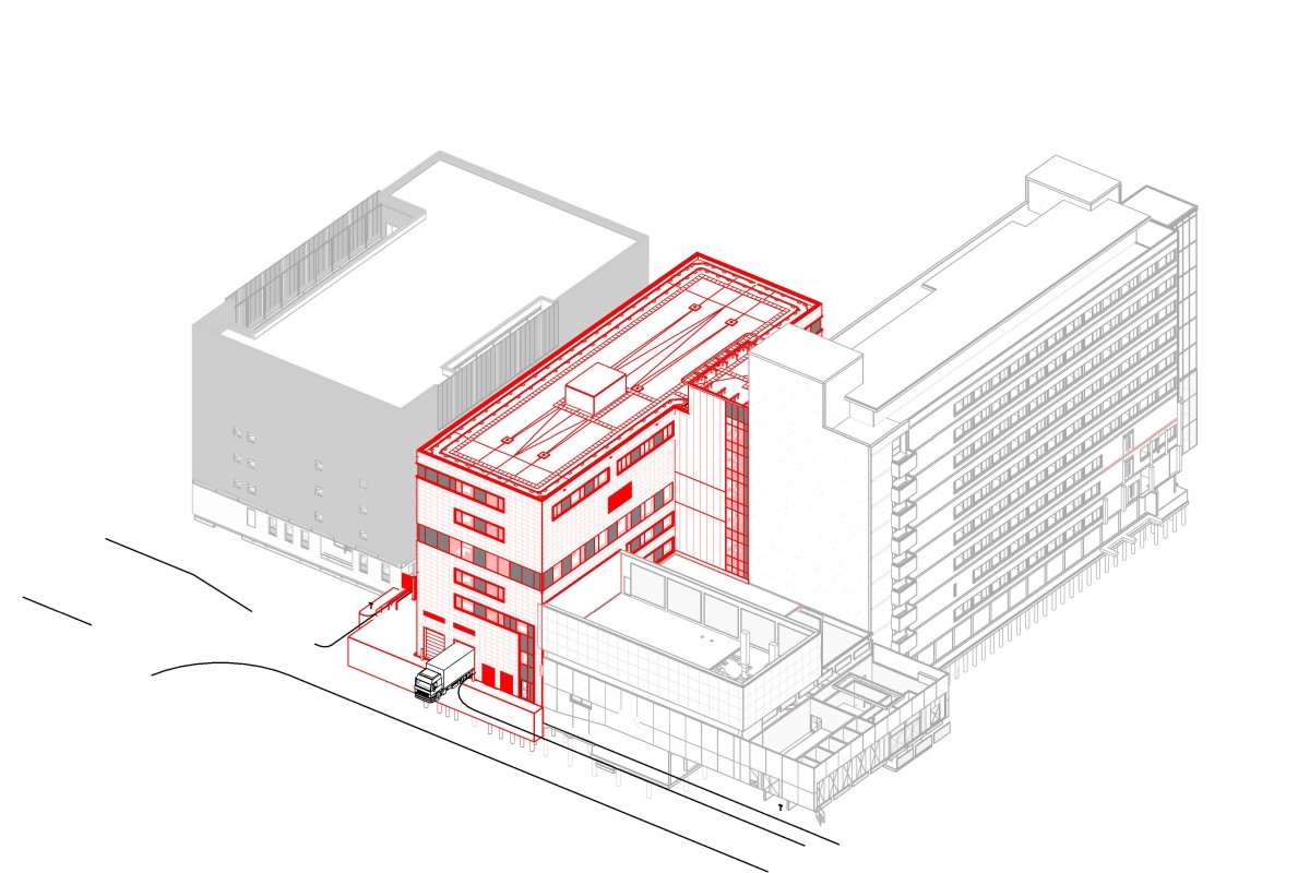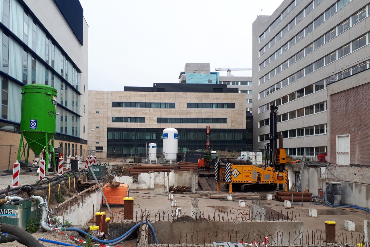 “Om het apotheekgebouw te kunnen realiseren, is een bestaand proefdiergebouw gesloopt”, vertelt Boris Nieuwpoort, directeur van SWINN. “Onder dit gebouw bevond zich een kelder, die deel uitmaakte van een belangrijke installatie-backbone. In overleg met het Antoni van Leeuwenhoek Ziekenhuis is besloten om deze kelder te behouden, zodat geen bouwput met bemaling nodig was. Bovendien konden de aansluitingen op de naastgelegen kelders intact blijven, zonder aanvullende voorzieningen. Echter brengt het bouwen op een bestaande kelder wel constructieve uitdagingen mee….”