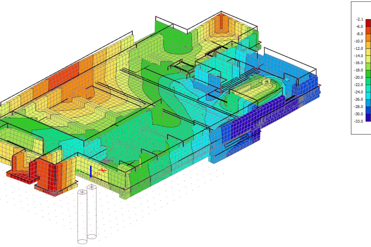 De nieuwbouw is gerealiseerd tussen twee gehandhaafde gebouwen, benadrukt Nieuwpoort. “Constructief hadden we in de grond niet alleen te maken met de bestaande palen onder de kelder, maar ook met de bestaande palen van de naastgelegen gebouwen én oude palen van de gesloopte bovenbouw. Daarnaast was er de opgave om een nieuw trappenhuis met lift te realiseren, die ook de bestaande kelder zou ontsluiten.” De draagstructuur van de bovenbouw stond op gespannen voet met de fundatie. “De dragende achterwand van de nieuwbouw staat namelijk direct tegen een bestaand gebouw. De oude palen onder deze achterwand zijn zoveel mogelijk benut, maar vanwege de grotere belasting waren nieuwe palen onvermijdelijk. Deze zijn op afstand van de bestaande palen gezet. Dankzij nieuwe wandschijven in de kelder gaat de kracht nu naar de nieuwe palen.” Om e.e.a. constructief te verantwoorden, heeft SWINN een 3D-rekenmodel van de bestaande kelder met de oude palen, nieuwe palen en nieuwe belastingen gemaakt. Hiermee zijn de verschillende stadia van sloop, bouw en eindsituatie getoetst op krachtwerking en scheurvorming.