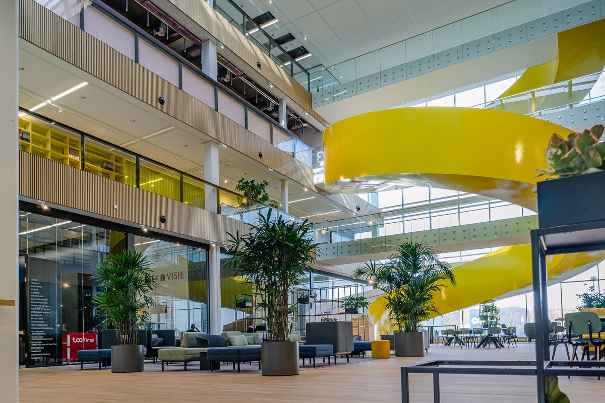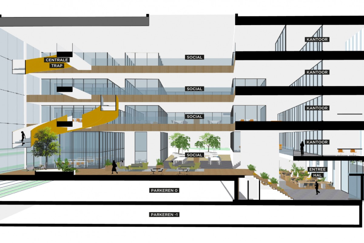 Nieuw kantoorgebouw van ca. 14.000 m² met vier kantoorlagen en twee parkeerlagen onder het gebouw voor ca. 150 parkeerplaatsen.