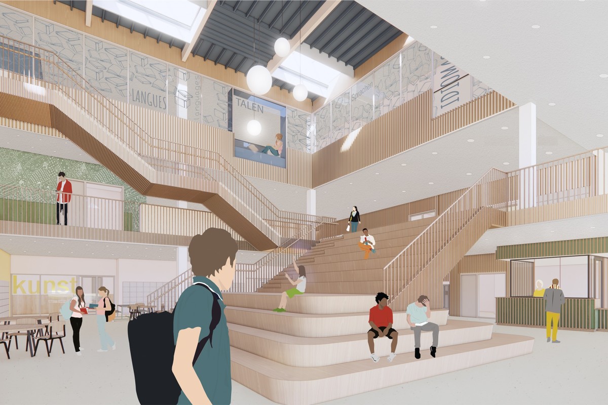 Nieuw schoolgebouw met een totaal bvo van 13.040 m² voor 500 leerlingen van SG Antoni Gaudí en 1400 leerlingen van het Da Vinci College.