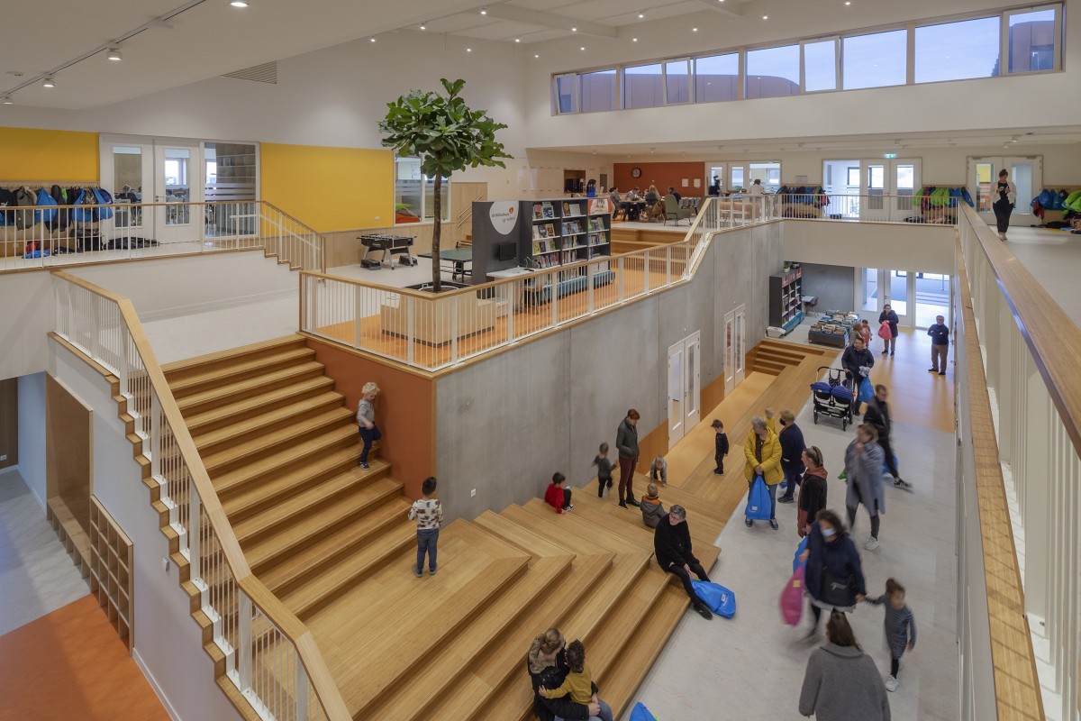 Het nieuwe, tweelaagse kindcentrum heeft een bvo van ca. 4.500 m² en huisvest o.a. twee basisscholen, kinderdagverblijf, bso en een bibliotheek.