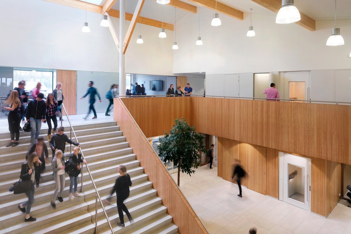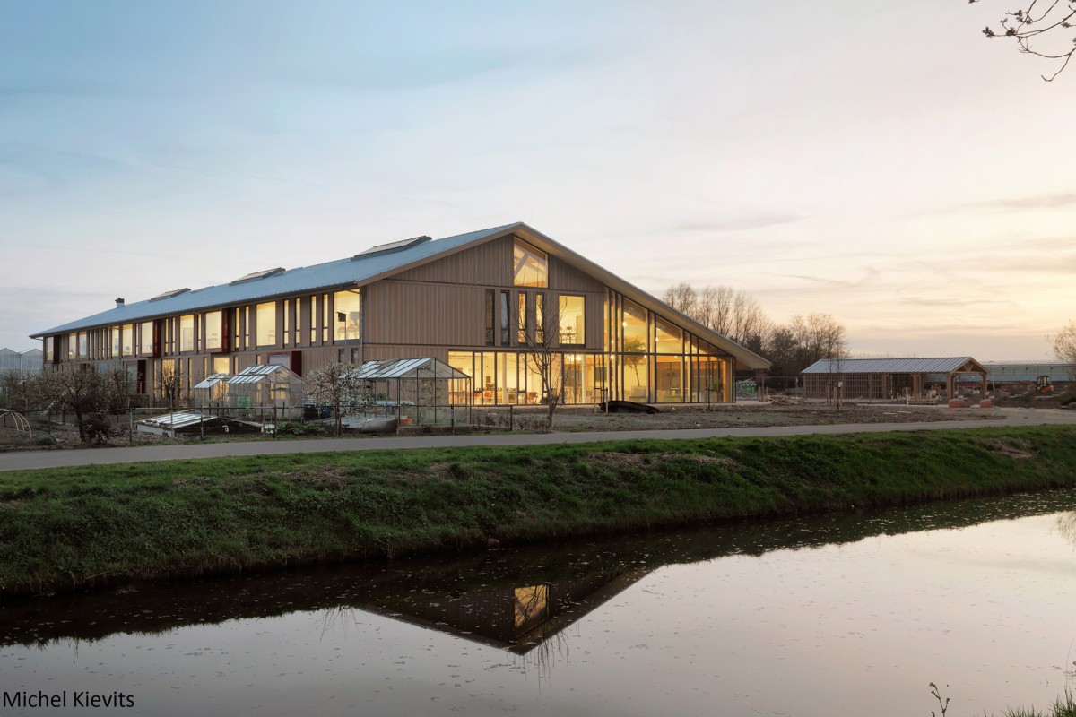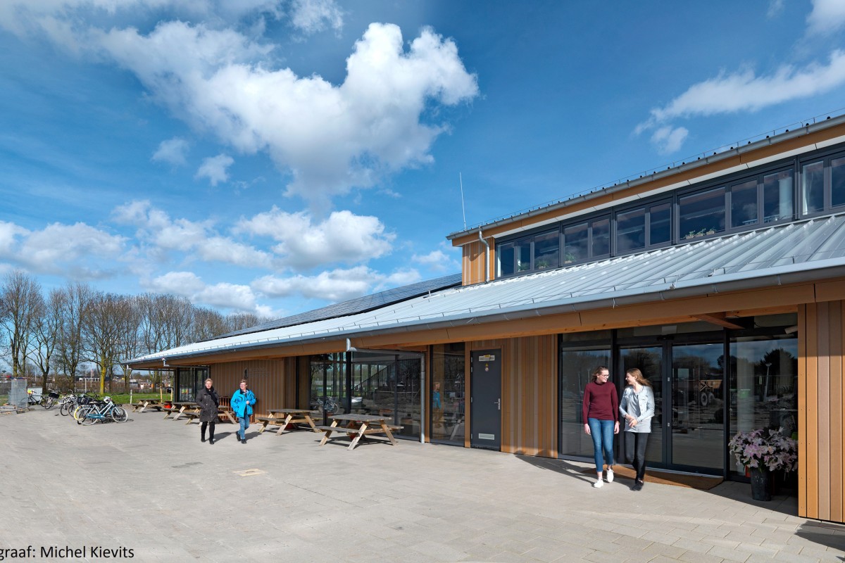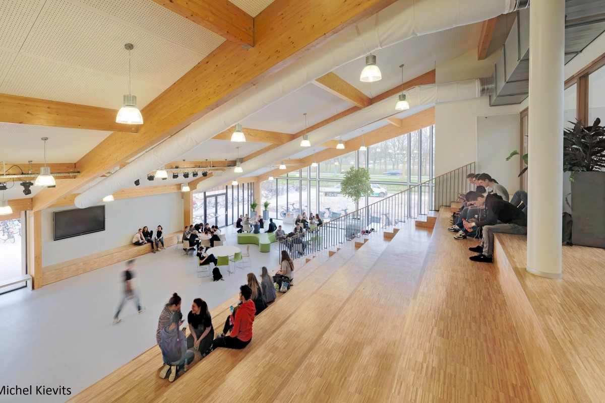 De nieuwe VMBO- en MBO-school voor groen, dierverzorging & business, 4.200 m² bvo, heeft houten gevels en een volledig houten kapconstructie.