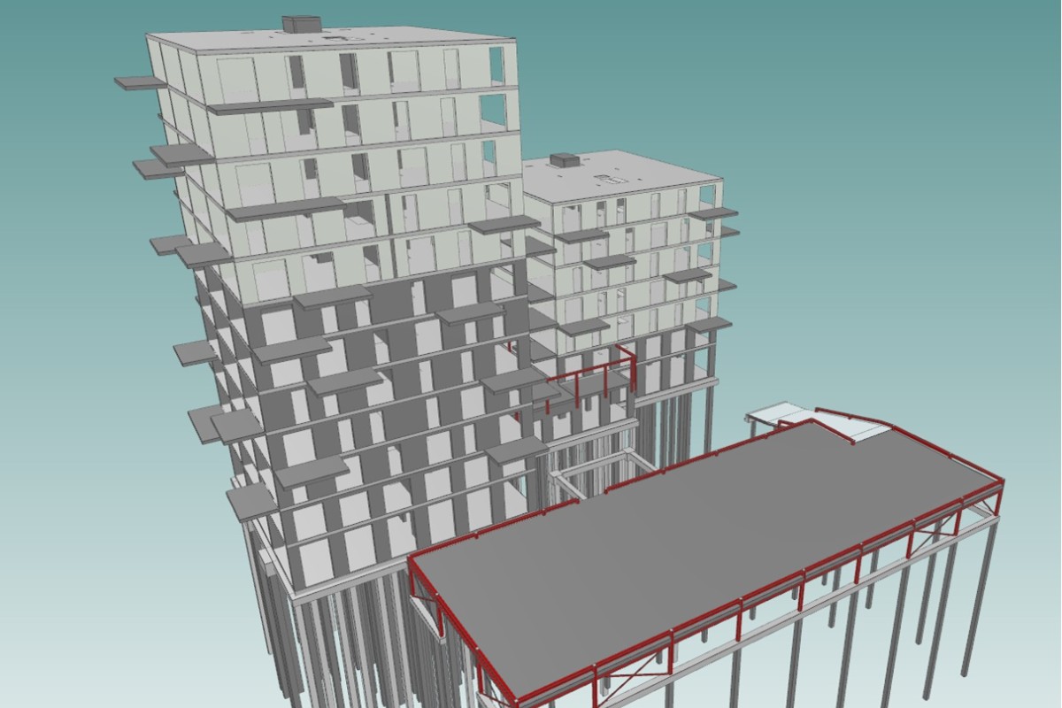 Nieuwbouw van 65 appartementen verdeeld over twee torens van 7 respectievelijk 12 lagen. De torens zijn verbonden door een enkellaagse plint.