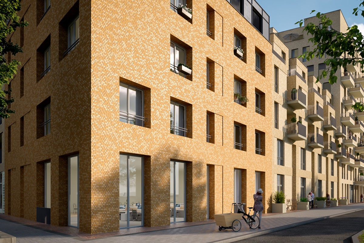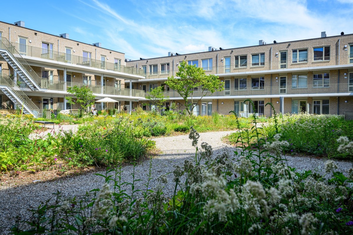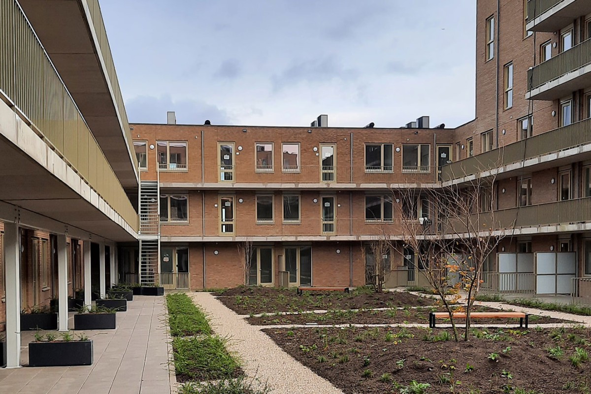 Twee gesloten bouwblokken voor 208 appartementen met een collectieve tuin en een parkeergarage.