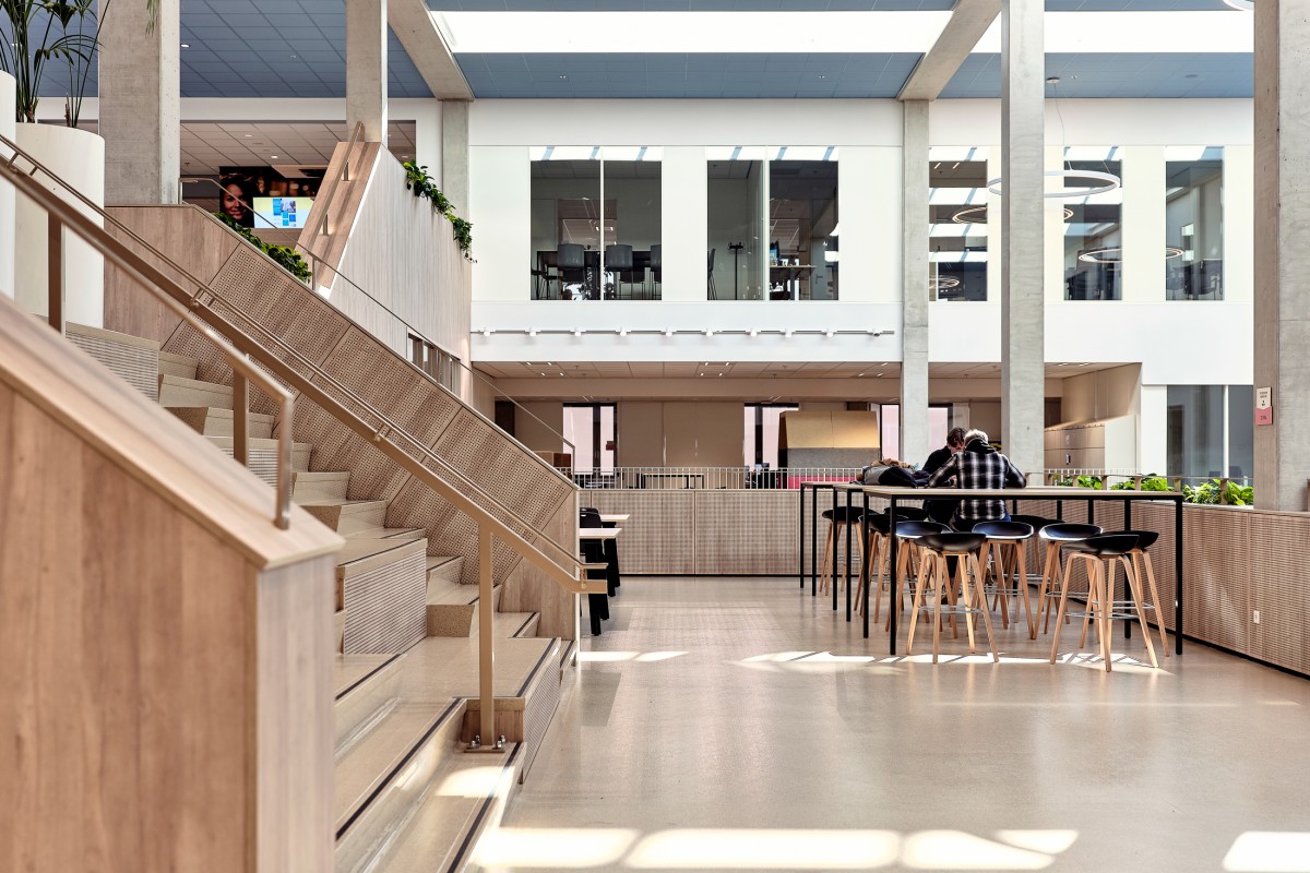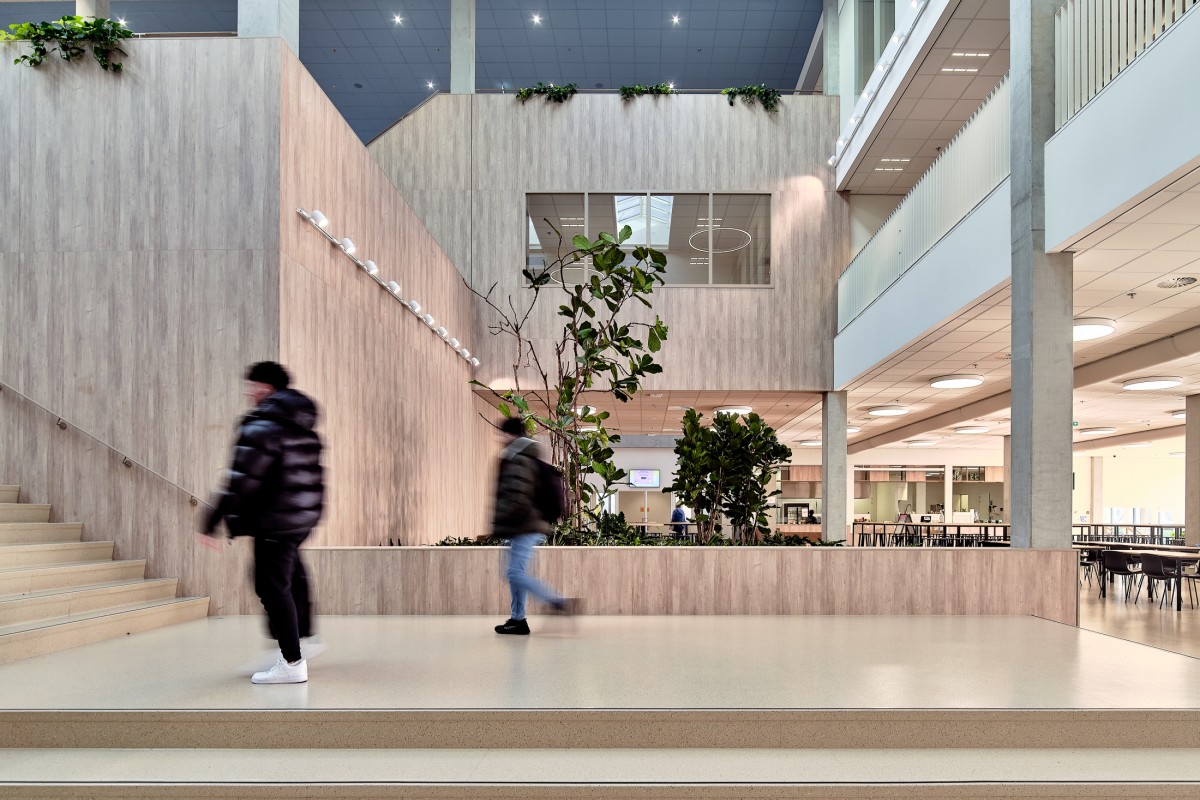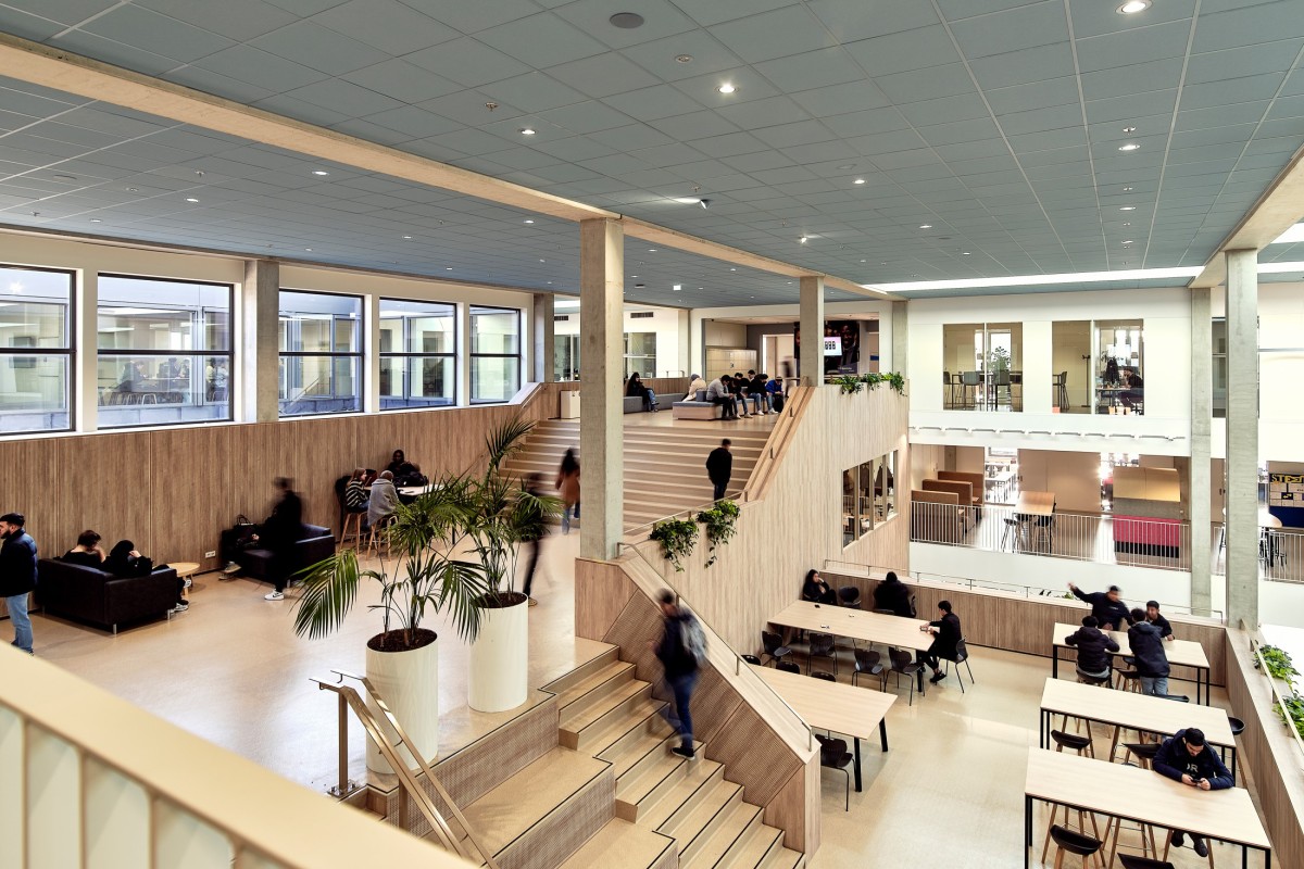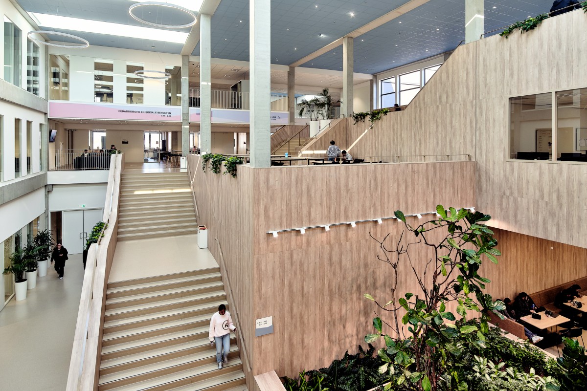 Het centraal gelegen atrium, een van de meest opvallende kenmerken, fungeert als een bruisend hart van het gebouw en verbindt de verschillende scholen met elkaar. De openheid en ruimtelijkheid van het atrium dragen duidelijk bij aan de levendige sfeer en het gevoel van verbondenheid binnen het complex.
