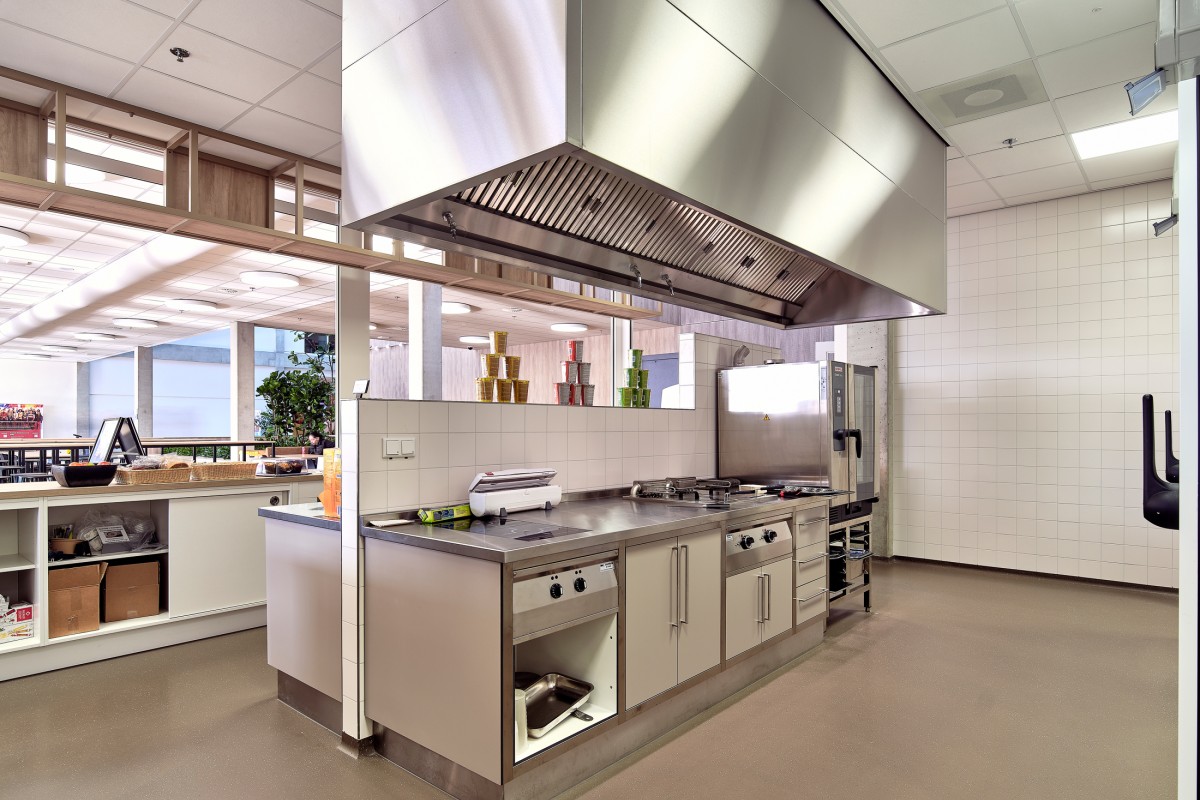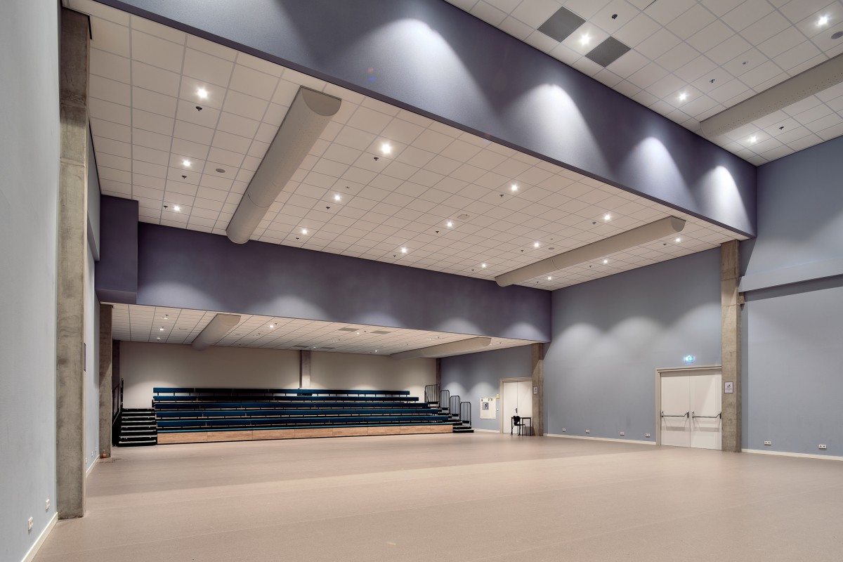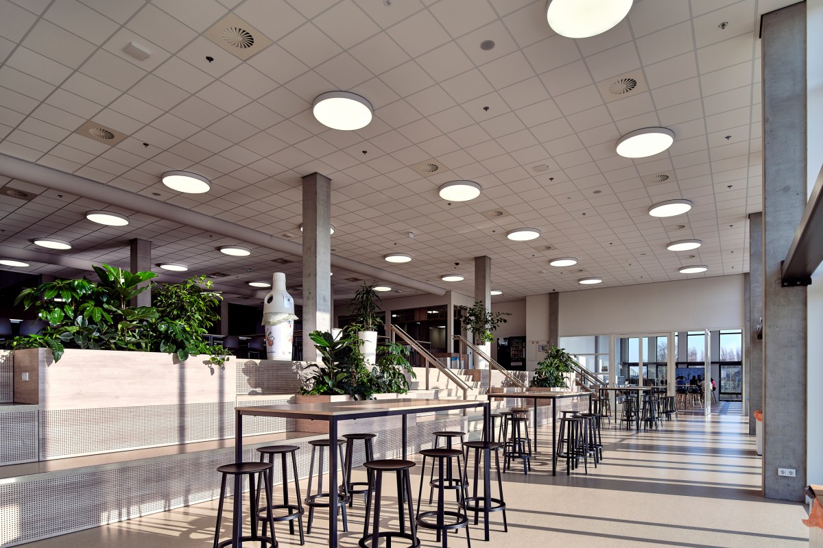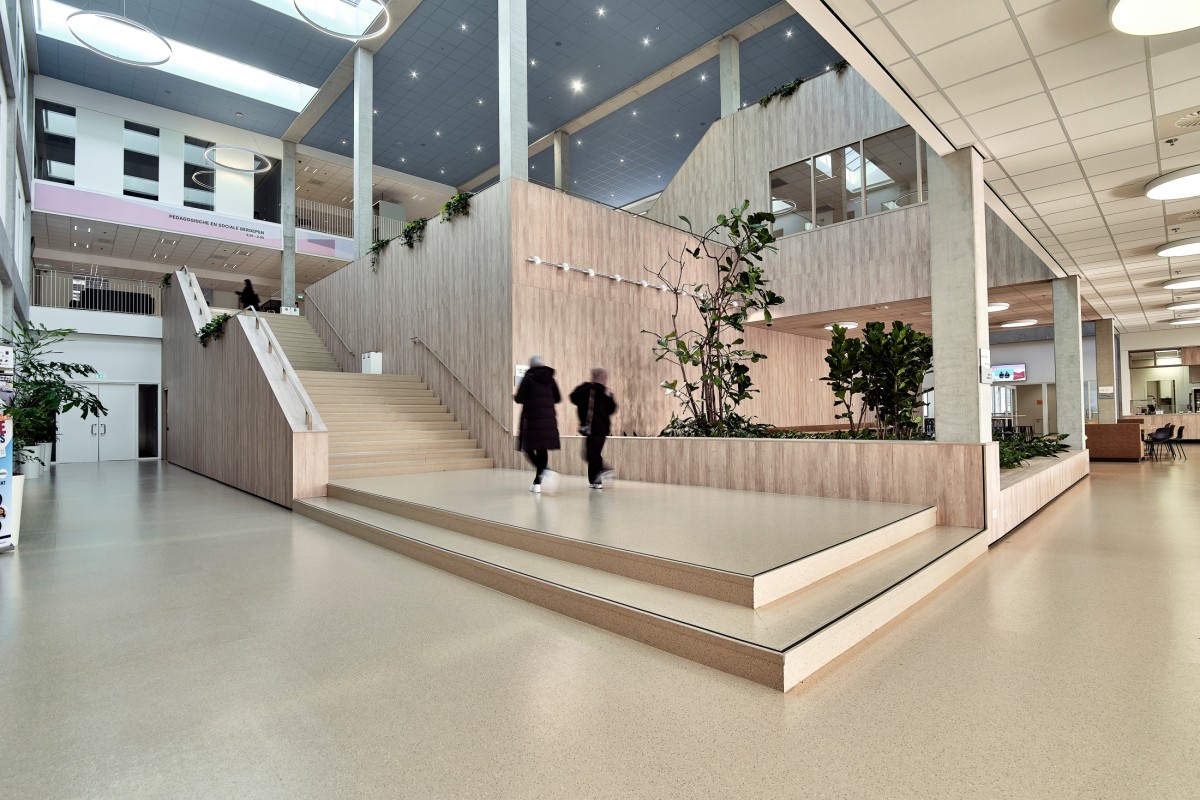 Het centraal gelegen atrium, een van de meest opvallende kenmerken, fungeert als een bruisend hart van het gebouw en verbindt de verschillende scholen met elkaar. De openheid en ruimtelijkheid van het atrium dragen duidelijk bij aan de levendige sfeer en het gevoel van verbondenheid binnen het complex.