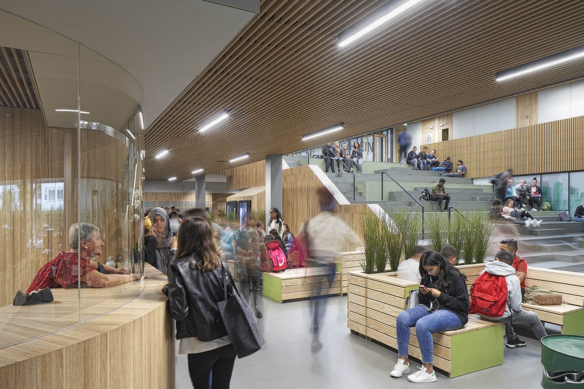 Niet alleen qua uitstraling maar ook functioneel krijgt de school verbinding met de buurt. De belangrijkste spil hierin zijn de bibliotheek en het eetcafé waar de buurt een hapje kan eten. De gymzaal, dansstudio en buurtruimte hebben een aparte entree en worden buiten schooltijd beschikbaar gesteld voor de buurt.