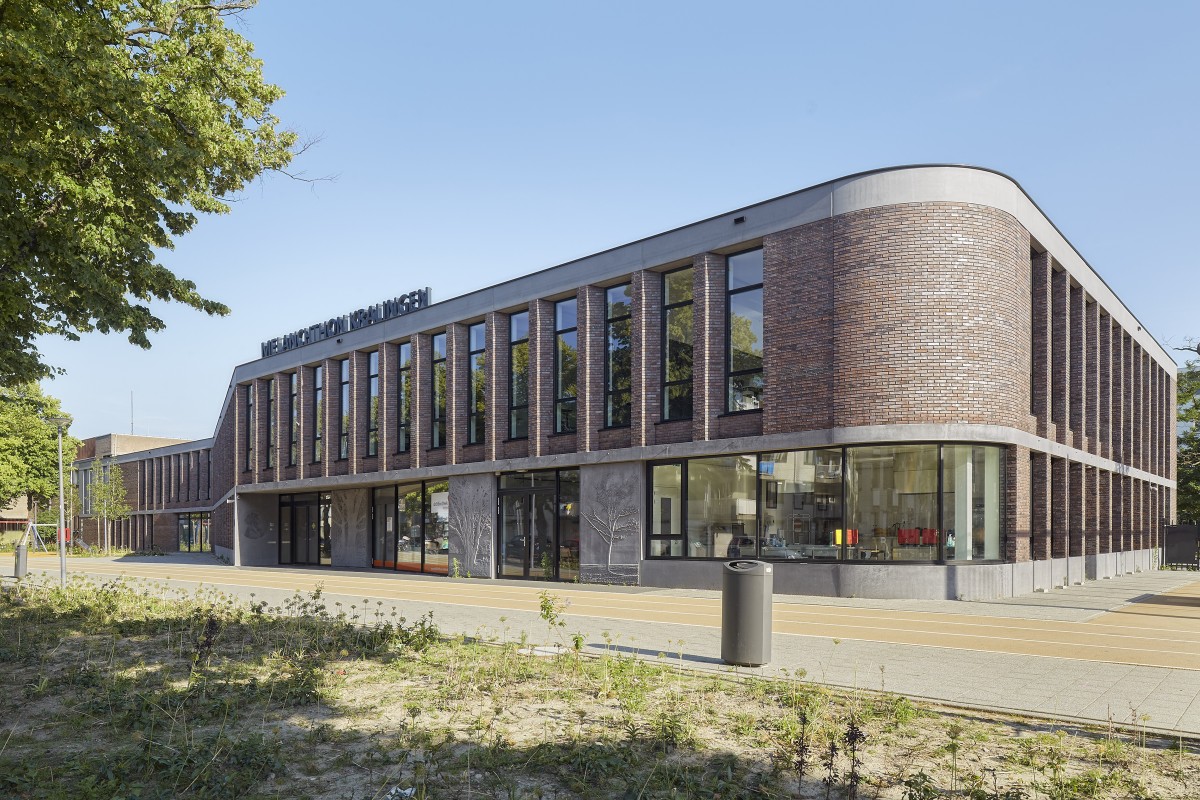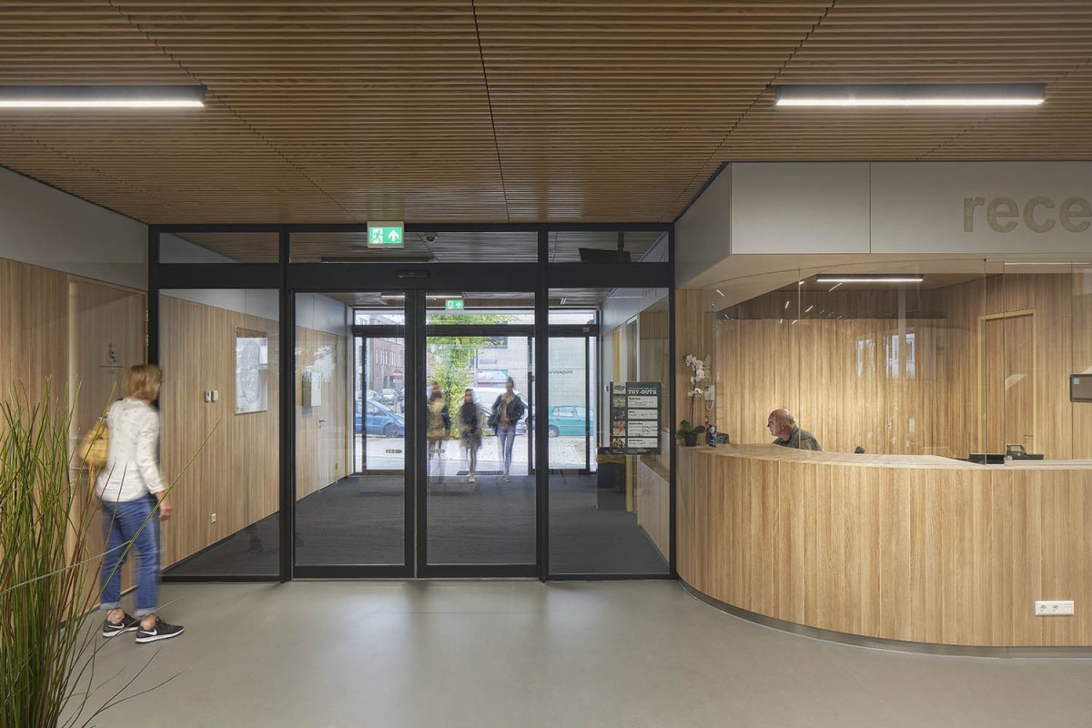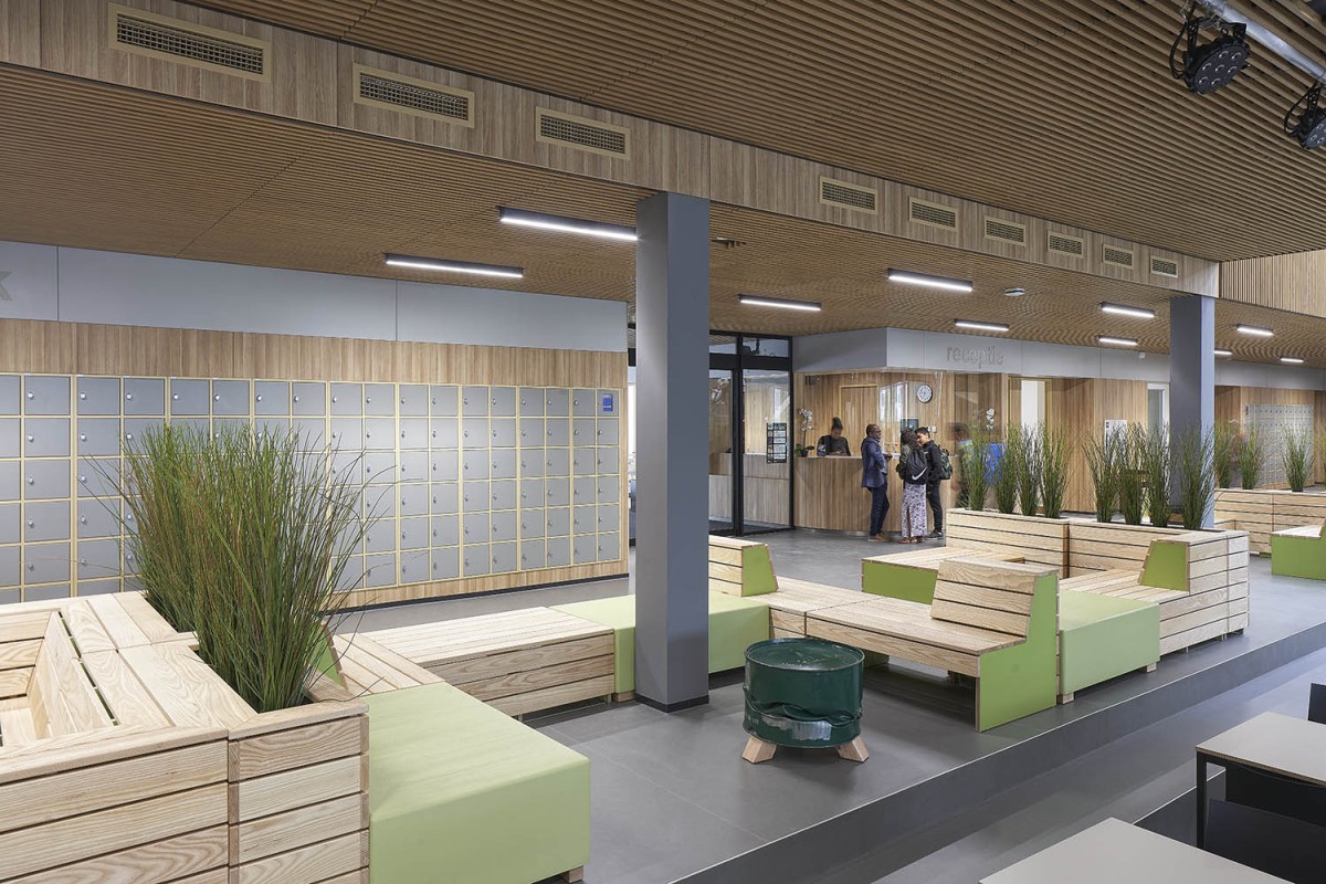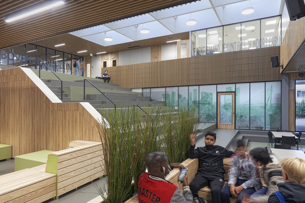 Als je als bezoeker binnenkomt, zie je meteen alles wat er te beleven valt. De aula, met een grote vide waar een tribunetrap in geplaatst is, vormt het hart van de school. Hier omheen liggen praktijklokalen en het eetcafé. Boven zijn de leerpleinen gekoppeld aan theorielokalen.