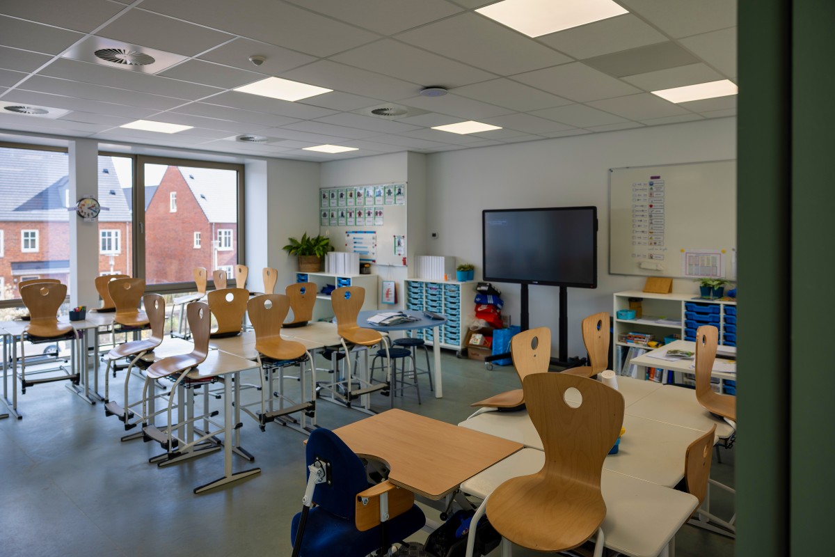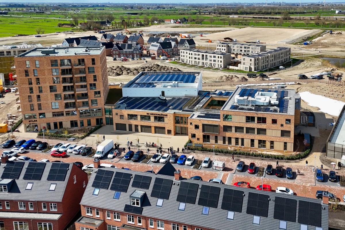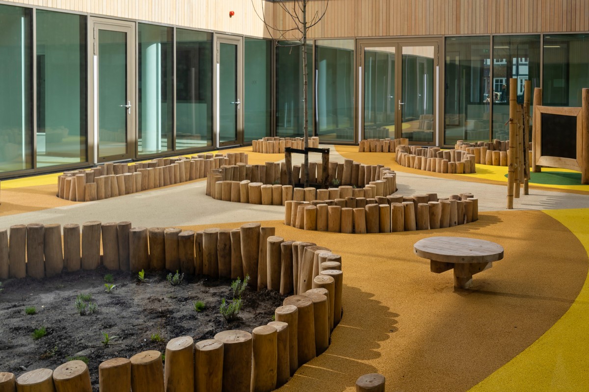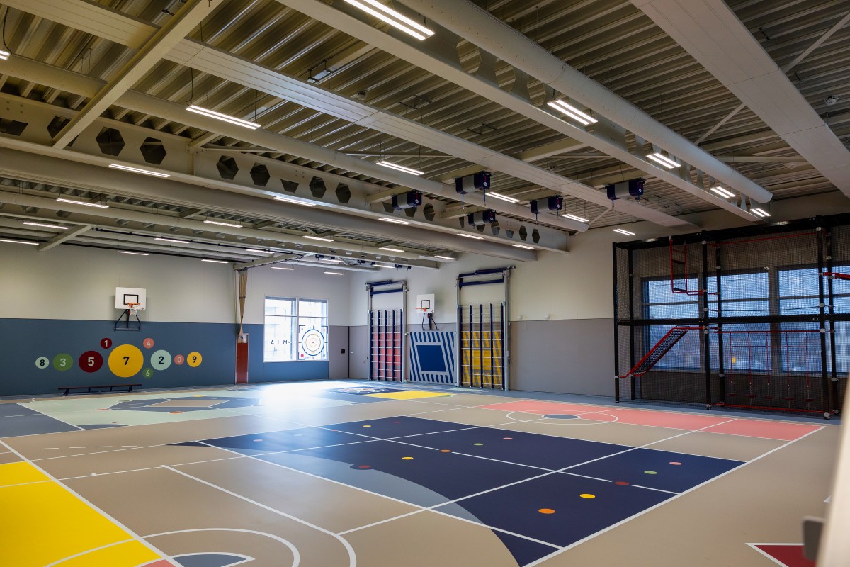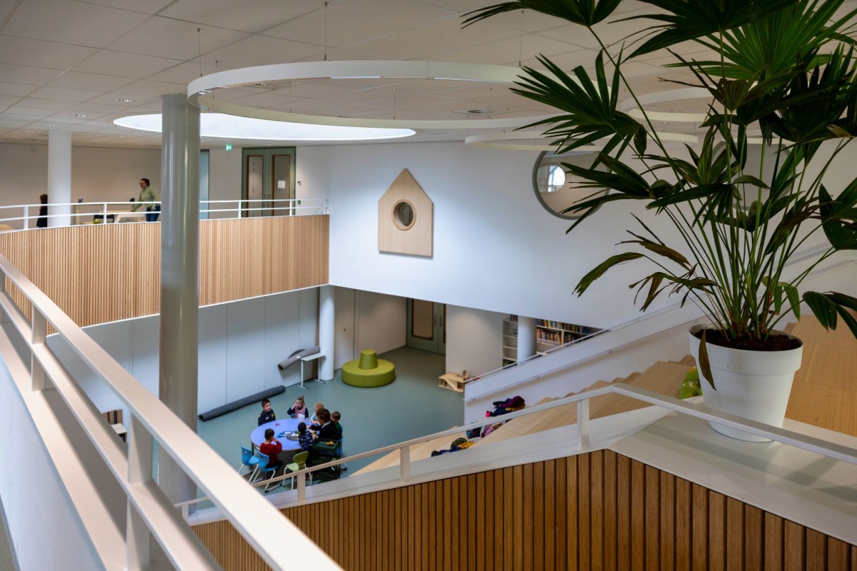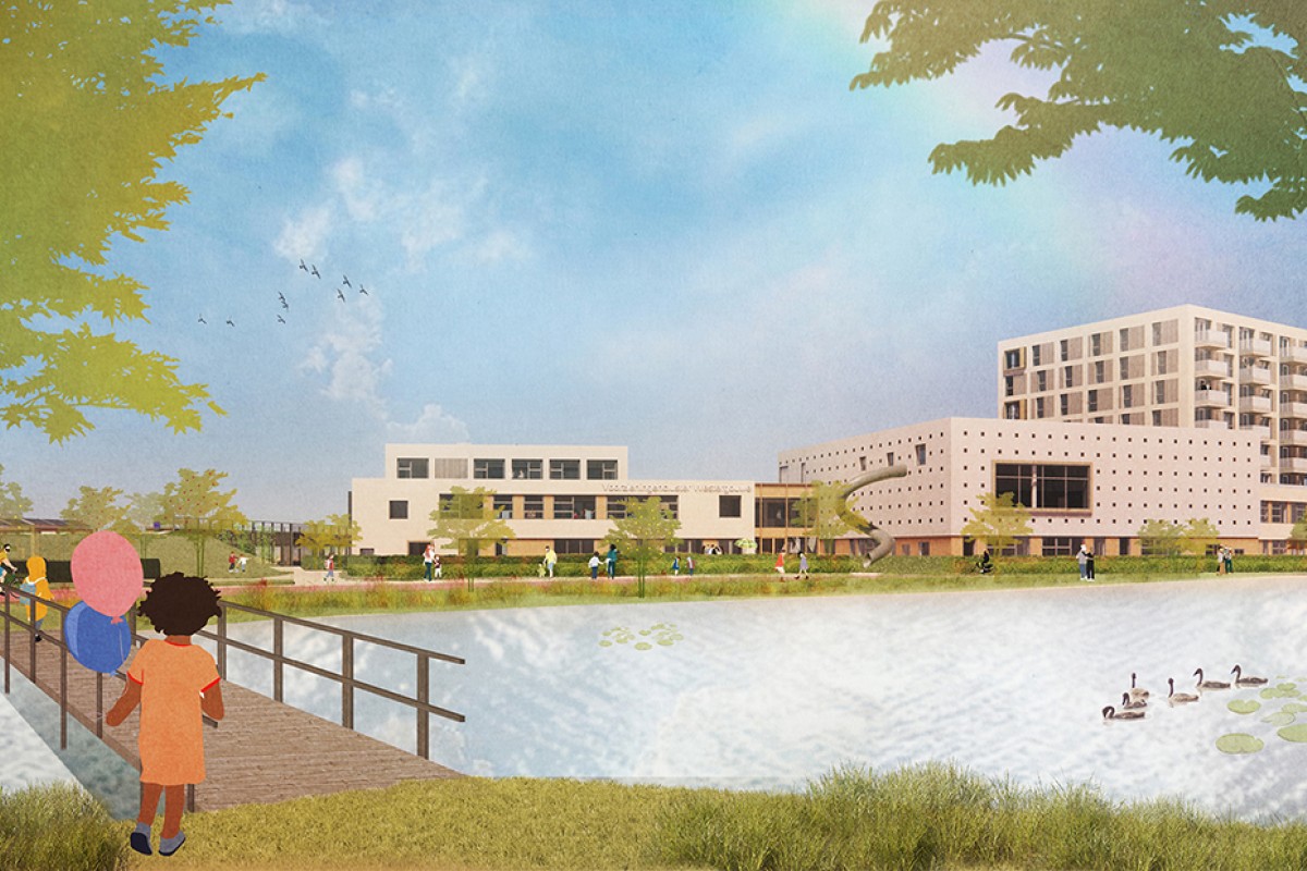 Dit nieuwe cluster van ruim 12.000 m² biedt onderdak aan een kindcentrum met een basisschool en kinderopvang, sportzalen en 42 appartementen.
